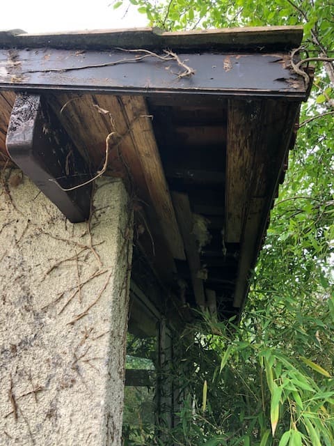 - la charpente, coté Ouest, est exposée à la pluie et aux intempéries. De nombreuses pièces de charpentes sont pourries dont le poteau en bois et la demi-ferme